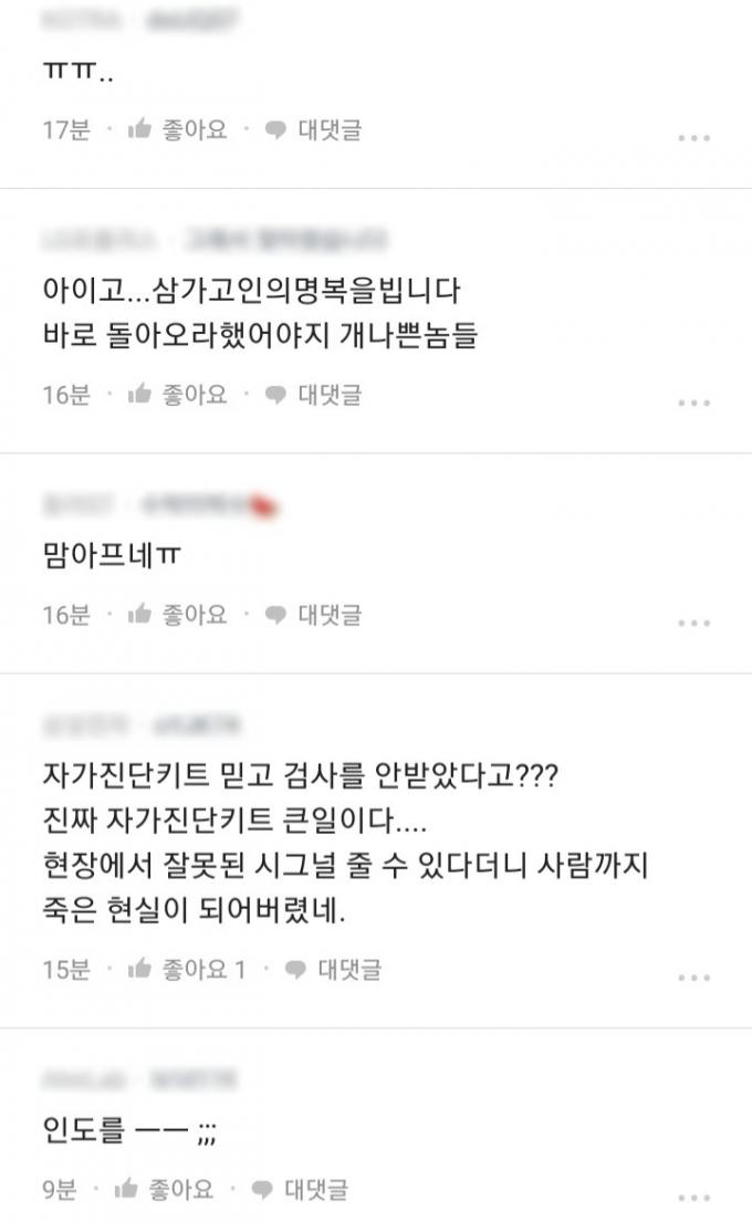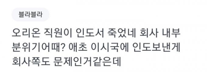 블라인드를 이용하는 한 직장인은 "이시국에 방역도 안되는 인도로 출장을 보낸 오리온 회사측이 이상하다"며 "현지에서 코로나19로 하루 몇천명 죽는 등 상황이 심각한데 왜 복귀를 안시켰는지 의문"이라며 "죽은 고인이 안타깝다"고 말했다.