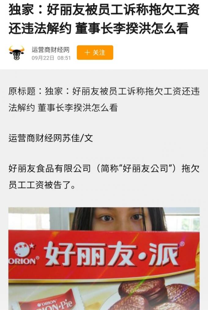 또 다른 중국 인터넷 매체 '百度'에서는 중국 오리온에 근무했던 직원이 임금체불로 오리온을 상대로 소송을 건 사건도 2019년 발생했다.