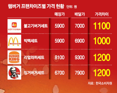 맘스터치를 제외한 롯데리아, 맥도날드, 버거킹, KFC 등 4개 업체의 모든 제품은 배달 주문 가격과 매장 구매 가격에 차이가 있었다. 업체들은 "일정 금액 이상 배달 주문할 경우 배달료를 별도 청구하지 않는 대신 제품 가격에 배달 서비스 관련 비용을 포함했기 때문"이라고 설명했다.