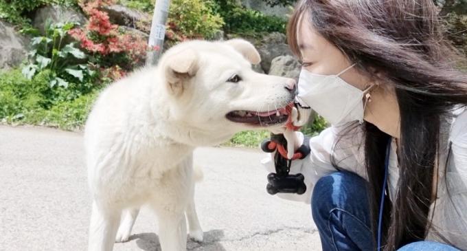 ▲송인선 '동물과 공존하는 세상' 대표가 강아지와 눈을 마주치며 교감하고 있다. [송인선 대표 제공]