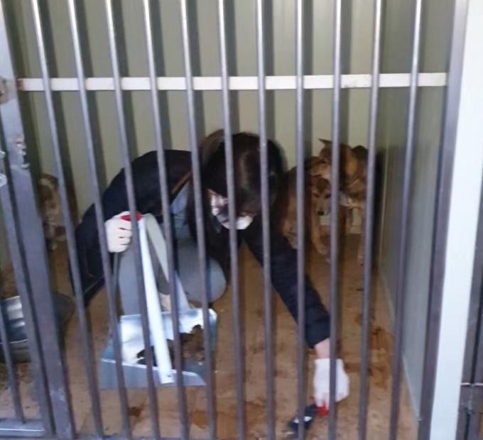 ▲견사 안에서 개들의 분비물을 치우는 송인선 대표 [송인선 대표 제공]