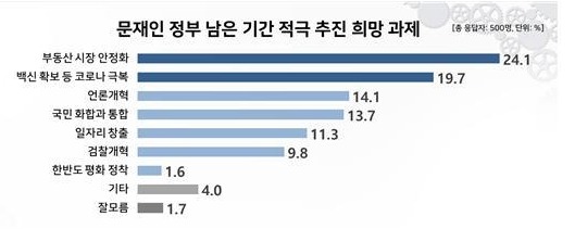 '백신 확보 등 코로나19 극복'라고 밝힌 응답은 19.7%였다. 이어 '언론개혁'(14.1%), '국민 화합과 통합'(13.7%), '일자리 창출'(11.3%) 등의 순이었다.