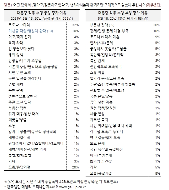 부정평가 이유로는 '부동산 정책'을 꼽은 응답이 30%로 가장 많았다. 이어 '경제·민생 문제 해결 부족' 10%, '코로나 19대처 미흡' 9%, '인사 문제' 5% 등의 순이었다. 반면 긍정평가 이유로 부동산 정책을 꼽은 응답은 2%에 불과했다.