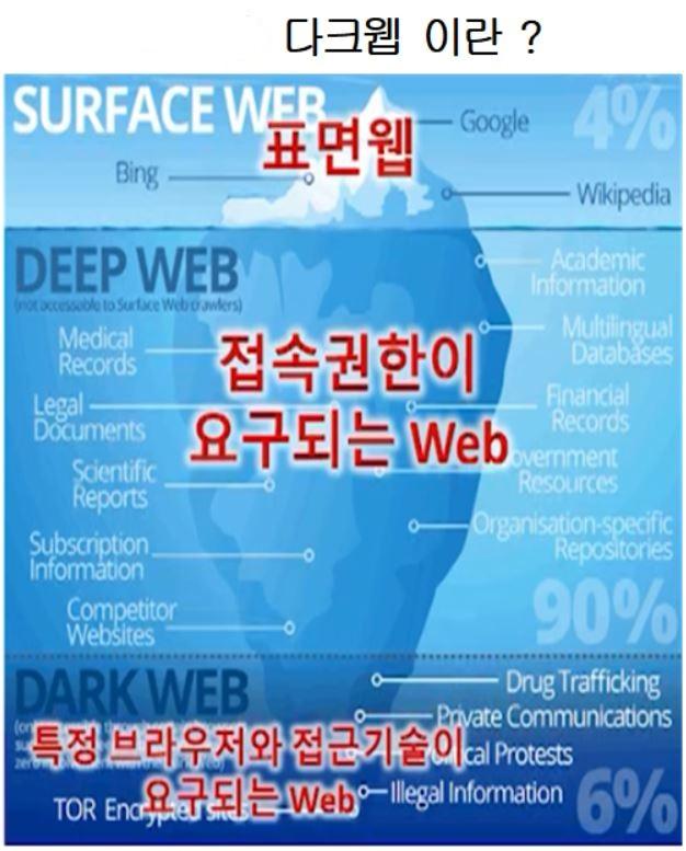 서 대표는 "웹을 빙산에 비유하자면 수면에 들어난 부분은 검색 가능한 웹(Surface Web)의 영역이고, 수면 아래에는 접속 권한이 필요한 딥웹(Deep Web)들이 존재하고 있다"며 "다크웹(Dark web)은 심해에 있어 보이지 않으며 특정 프로그램으로만 접근할 수 있다"고 설명했다.