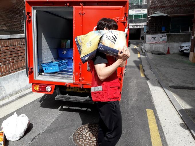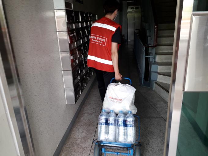 머무를 시간이 없다. 이후 비냉동·냉장 물품을 꺼내 하나로 모은다. 부피가 작은 물건들은 홈플러스 봉지로 감싸고 생수 다발과 같은 큰 물품은 수레에 싣는다. 모든 물품에 대한 재포장을 마치고 요청 사항에 따라 직접 배송 물품을 전하기도 하며, 문 앞에 두고 사진을 찍기도 한다. 그마저도 엘리베이터가 없는 빌라를 만나면 시간과 노력이 더 필요하다.