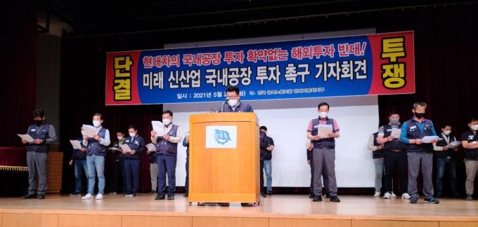 현대차 노조는 25일 울산 북구 현대차 문화회관에서 기자회견을 열고 "사측이 해외 투자를 강행하면 노사 공존은 불가능하다"고 밝혔다.