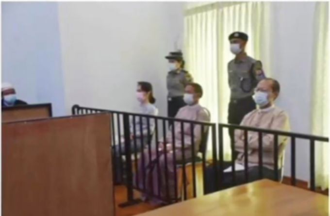아웅산 수치(왼쪽) 미얀마 국가 고문과 윈민 대통령이 24일(현지시간) 수도 네피도의 특별 법정에 출석해 있다. 수치 고문은 지난 2월1일 미얀마 군부 쿠데타 이후 처음으로 법정에 출석했다. 사진은 미얀마 군부의 미야와디 TV 화면. [AP 뉴시스]