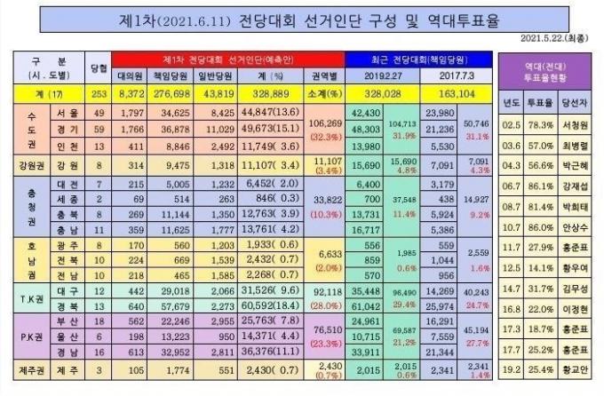 구성안에 따르면 전국 17개 시도의 253개 당원협의회에서 대의원과 책임·일반당원 합쳐 32만8889명이 선거인단에 참여할 예정이다. 이중 TK(대구·경북)권은 당협이 25개에 불과한데 선거인단은 무려 28.0%(9만2118명)에 달한다. PK(부산·울산·경남)권은 당협 40개에 선거인단이 23.3%(7만6510명)이다. 영남인 TK와 PK를 합친 선거인단은 51.3%로 과반이다.