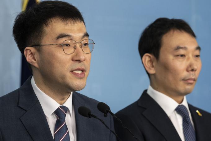 ▲더불어민주당 김남국 의원(왼쪽)이 변호사 시절인 지난해 2월 7일 서울 여의도 국회 정론관에서 민주당 입당 기자회견을 하고 있다. 오른쪽은 민주당 김용민 의원. [문재원 기자]