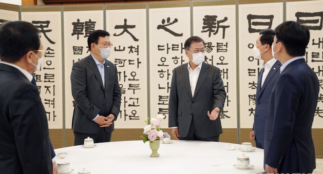 ▲문재인 대통령이 26일 청와대에서 열린 여야 정당 대표 초청 대화에서 사전환담을 하고 있다. [뉴시스]