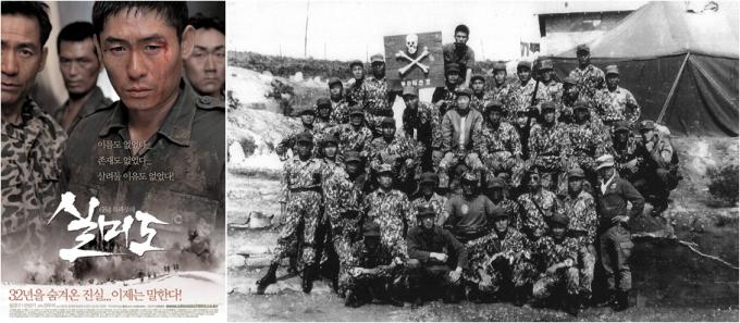 ▲ 1.21사태를 계기로 창설된 공군 2325부대(OSI) 209파견대, 일명 실미도 오소리부대원들(오른쪽)과 이들의 비극적 실태를 극화한 영화 '실미도' 포스터
