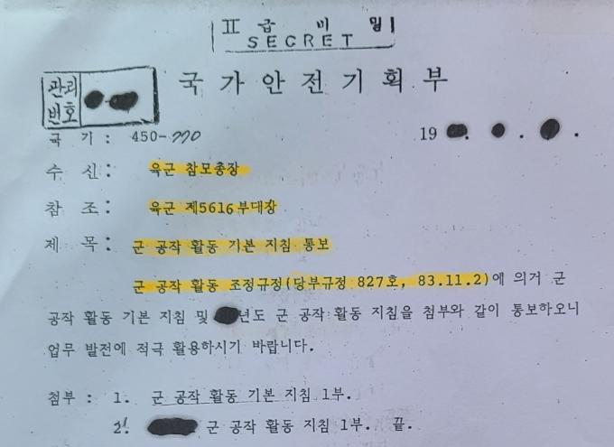▲ 국정원의 전신인 국가안전기획부가 군 정보기관인 국방정보본부, 육군 정보사, 해군 정보부대, 공군 정보부대에 배포한 '군 공작활동 기본지침 통보'의 일부. '군 공작활동 기본지침'은 중앙정보부 창설 직후인 1964년애 처음 제정돼 안기부를 거쳐 현재 국정원에서도 유지되고 있다.