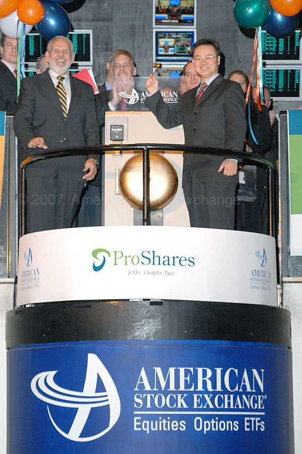 ▲ 미국 증권거래소 중 하나인 American Stock Exchange(지금은 New York Stock Exchange에 합병됨)의 오프닝 벨(미국 증시는 오전 9시30분 개장) 행사에서 이태용(오른쪽) 웨이브릿지 글로벌 전략 헤드가 타종 후 망치를 들고 미 증권거래소 관계자들과 함께 기념 촬영을 하고 있다. 2006년 6월 미국 최초의 레버리지·인버스 상장지수펀드(ETF) 출시 기념. [웨이브릿지 제공]