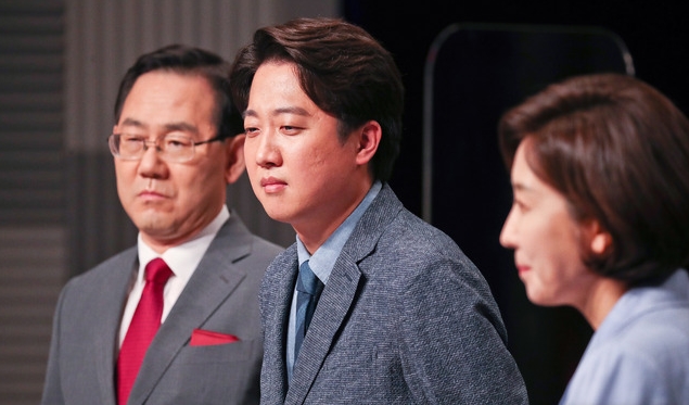 ▲국민의힘 주호영(왼쪽부터), 이준석, 나경원 당대표 후보가 지난 31일 오후 서울 상암 MBC스튜디오에서 100분토론을 하기 위해 기다리고 있다. [뉴시스]