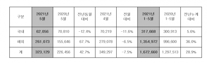 이는 지난해 같은 기간과 비교해 국내 판매는 12.4% 감소, 해외 판매는 67.7% 증가한 수치다.