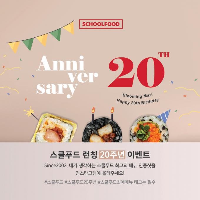 올해 20주년을 맞이하는 스쿨푸드는 오랜 시간 자사를 이용해준 고객들의 성원에 보답하기 위해 인증샷 이벤트를 진행한다. 참여방법은 오는 30일까지 자신이 생각하는 스쿨푸드의 베스트 메뉴를 주문한 인증샷을 찍어 지정된 해시태그와 함께 인스타그램에 올리면 된다.