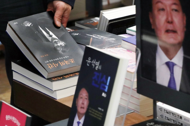 ▲ 조국 전 법무부 장관의 회고록 '조국의 시간'과 윤석열 전 검찰총장을 다룬 책 '윤석열의 진심'이 지난달 31일 오후 서울 종로구 교보문고 광화문점에 함께 진열돼 있다. [뉴시스]