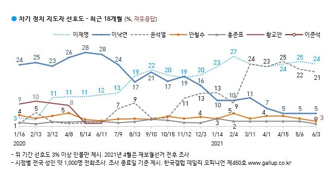 이재명 경기지사는 24%, 윤석열 전 검찰총장은 21%로 양강 대결 구도를 이어갔다. 더불어민주당 이낙연 전 대표는 5%였다. 이 후보는 3%. 국민의당 안철수 대표는 2%, 정세균 전 국무총리와 무소속 홍준표 의원은 각 1%로 집계됐다.