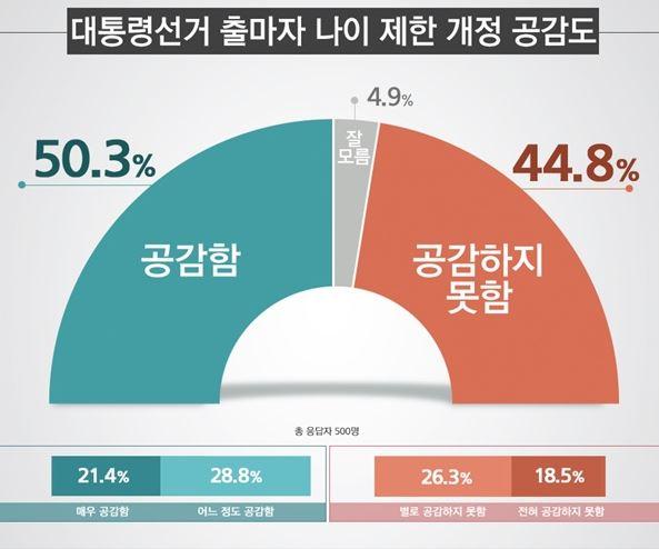 여론도 팽팽하다. 리얼미터가 전날 발표한 여론조사 결과(오마이뉴스 의뢰, 1일 전국 만 18세 이상 남녀 500명 대상 실시) 결과 국민들은 '대통령선거에 출마할 수 있는(피선거권) 연령을 현행 만 40세보다 낮춰야 한다'는 주장에 "공감한다" 50.3%, "공감하지 않는다" 44.8%로 나타났다.