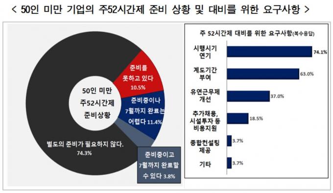 경총은 "50인 미만 중소·영세기업은 경영여건상 근로시간 단축에 대응하기 어려운 것으로 나타났고, 더욱이 코로나19 사태가 여전히 진행 중이기 때문에 50인 미만 기업들에 대한 주 52시간제는 시행시기 연기나 계도기간 부여가 필요하다"고 강조했다.