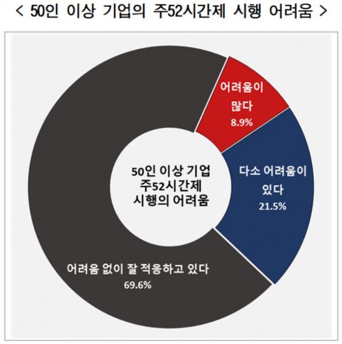 주 52시간제를 시행 중인 50인 이상 기업의 30.4%도 주 52시간제로 인해 어려움을 겪고 있는 것으로 응답했다.