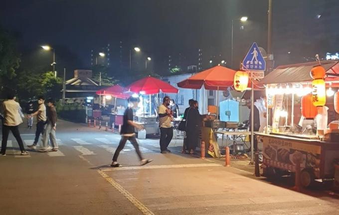 공원 한쪽에서는 헌팅족들을 겨냥해 안주를 파는 포장마차들이 줄지어 늘어서 있었다. 편의점 안주, 배달음식으로는 수요를 감당하기 역부족인지 이곳에서 안주를 사서 돗자리로 향하는 이들도 많았다.