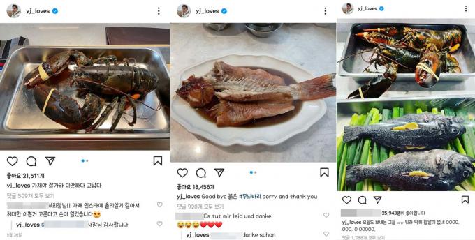지난달 25일 정 부회장은 인스타그램에 우럭 요리 사진과 함께 "잘 가라 우럭아. 니가 정말 우럭의 자존심을 살렸다. 미안하다 고맙다"는 내용의 게시물을 올렸다. 이어 26일에는 가재 사진을 올리며 "가재야 잘가라 미안하다 고맙다"고 썼다.