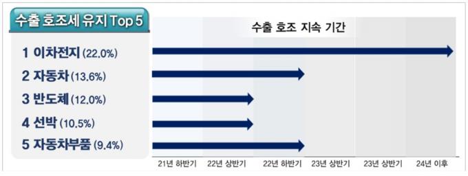 특히 2차 전지는 수출 호조세 예상 지속 기간이 '2024년 이후'(40.0%), '2023년 하반기'(30.0%)로 나타나 가장 길었다.