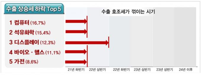 수출 호조세가 가장 먼저 꺾일 '톱 5' 품목은 컴퓨터(16.7%), 석유화학(15.4%), 디스플레이(12.3%), 바이오·헬스(11.1%), 가전(8.6%) 순으로 나타났다.