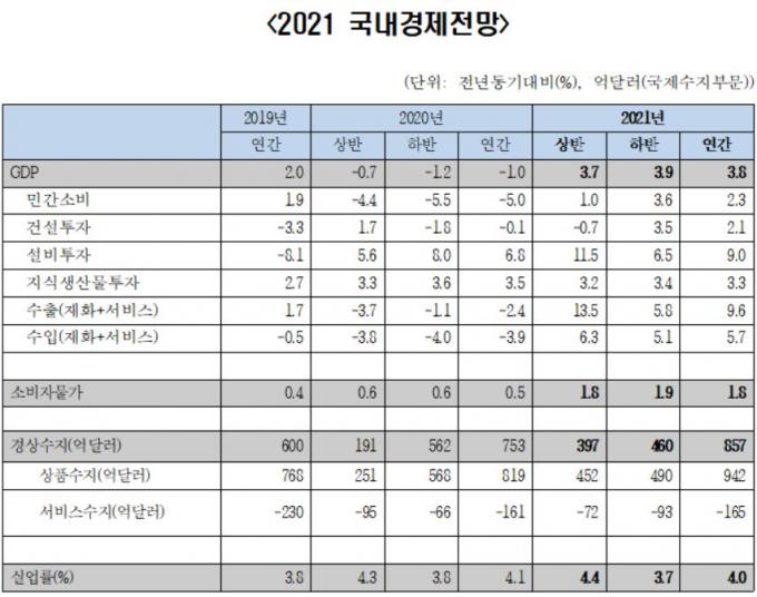 올해 경제성장률이 3%대 후반 수준으로 올라설 것이라는 전망이 나왔다. 세계 경기의 빠른 회복에 따른 수출 호조가 전반적인 경기회복 흐름을 주도할 것이란 분석이다. 지난해 우리나라는 -1.0% 역(逆)성장을 기록했다.