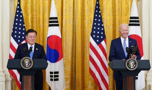 ▲문재인 대통령이 지난달 21일 오후(현지시간) 미국 워싱턴 백악관 이스트룸에서 조 바이든 미국 대통령과 공동기자회견을 하고 있다. [뉴시스]