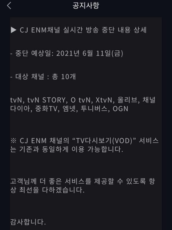 ▲ LG유플러스가 지난 1일 CJ ENM 채널의 실시간 방송 종료 가능성을 공지했다. [LG유플러스 공지사항 갈무리]