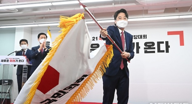 ▲국민의힘 이준석 신임 당대표가 11일 오전 서울 여의도 당사에서 열린 전당대회에서 당기를 흔들고 있다. [뉴시스]