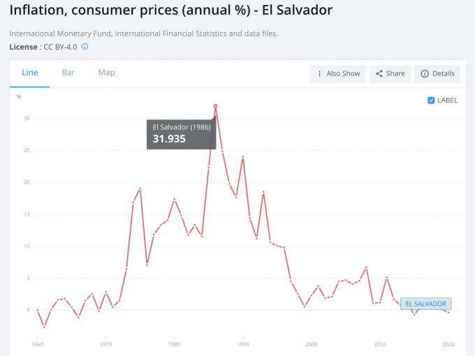 세계은행(WB)에 따르면 엘살바도르는 1980년대에 30%가 넘는 높은 인플레이션을 겪었다. 2001년 이후로는 6%대에서 -0%대 사이를 등락하고 있다.