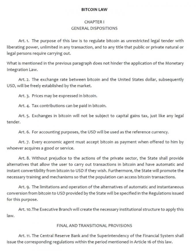 법안에 따르면 엘살바도르는 가상자산인 비트코인을 제2의 법정통화로 채택함에 따라 엘살바도르 국민들은 앞으로 비트코인으로 세금을 내고 물건값을 치를 수 있게 된다.