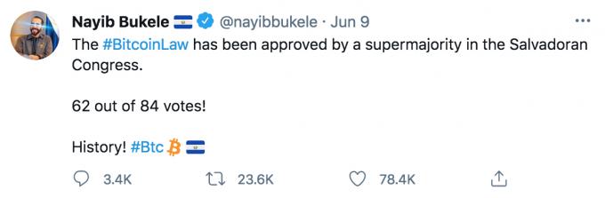 나이브 부켈레 엘살바도르 대통령이 지난 5일 미국에서 열린 '비트코인 2021 콘퍼런스'에서 비트코인을 법정통화로 채택하겠다는 구상을 밝혔고, 지난 8일 밤 여당이 장악한 엘살바도르 의회에서 관련 법안이 총 84명 중 62명의 찬성으로 통과됐다.