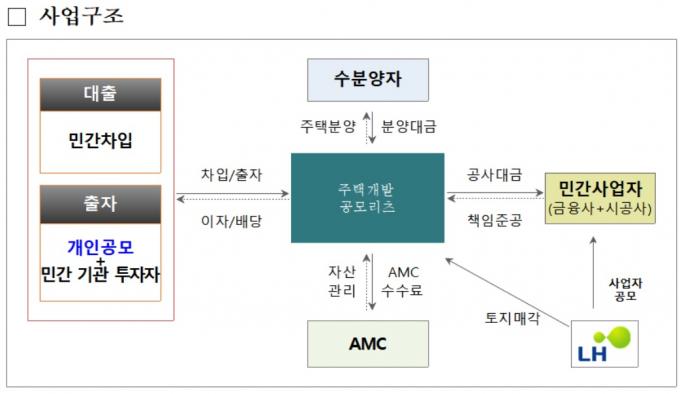 주택개발 공모리츠는 기존 주택개발리츠에 주식 공모 확대를 통해 국민과 개발이익을 공유한다. 건설사, 금융사로 구성된 민간 컨소시엄이 리츠를 설립하고 리츠에서 LH의 공동주택용지를 매입해 주택을 건설·분양하는 방식이다.