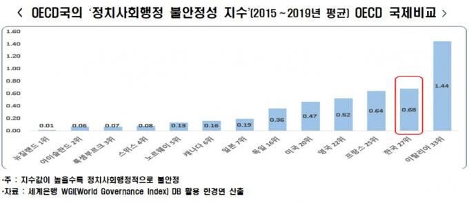 한경연은 정치·사회·행정적 불안정성이 경제성장에 미치는 효과를 추정하기 위해 세계은행의 '정치적 안정성 지수'와 '정부 효과성 지수'를 활용해 '정치·사회·행정 불안정성 지수'를 산출했다. 국가별로 산출된 정치·사회·행정 불안정성 지수를 최근 5년간(2015~2019년) 평균하면, 한국의 OECD 순위는 34개국 중 27위였다.