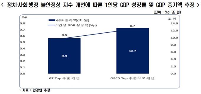 시뮬레이션 결과 우리나라 정치·사회·행정 불안정 수준이 G7 1위 수준으로 안정되는 경우에는 1인당 GDP성장률이 0.5%포인트, OECD 1위 수준일 경우에는 0.7%포인트 개선되는 것으로 분석됐다.