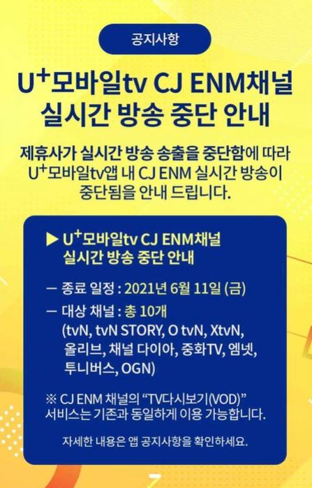 14일 업계에 따르면 LG유플러스와 CJ ENM은 지난 11일 늦은 밤까지 콘텐츠 사용료에 관한 협상을 벌였으나 합의에 이르지 못했다. 이에 다음날인 12일 자정부터 LG유플러스의 모바일TV인 'U+모바일tv'에서 CJ ENM의 10개 채널이 송출 중단됐다.