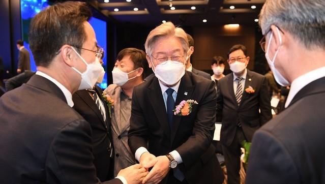 ▲이재명 경기지사(가운데)가 지난달 20일 서울 여의도 중소기업중앙회에서 열린 대한민국 성장과 공정을 위한 국회 포럼 창립총회에서 기념촬영을 마친 뒤 참석자들과 인사하고 있다. [뉴시스]