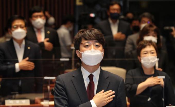 ▲ 국민의힘 이준석 대표가 지난 14일 오후 서울 여의도 국회 예결위 회의장에서 열린 의원총회에 참석해 국민의례를 하고 있다. [뉴시스]