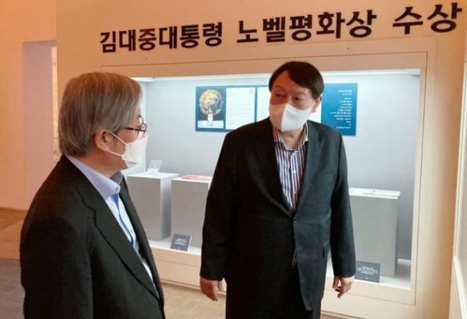 ▲ 윤석열 전 검찰총장이 지난 11일 서울 마포구 '연세대 김대중 도서관'을 방문해 김성재 김대중평화센터 상임이사로 부터 설명을 들으며 전시물을 둘러보고 있다. [윤 전 총장 측 제공]
