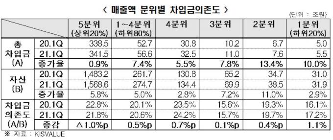 기업 규모별로 보면 매출액 상위 20% 기업의 차입금의존도는 1.0%p 감소한 21.8%를 기록했지만, 하위 80% 기업은 0.5%p 증가한 20.6%를 나타냈다. 상위 20% 기업은 재무 안전성이 개선됐지만 하위 80%는 악화했다는 의미다.