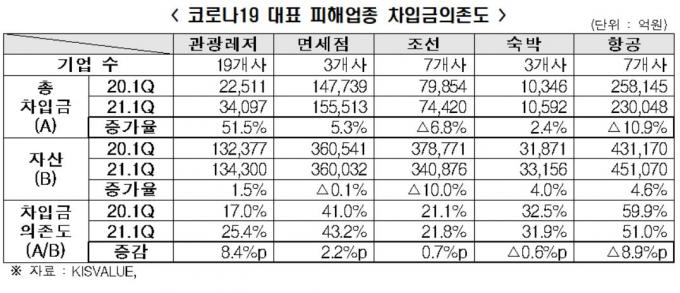 코로나19 피해를 크게 본 5대 업종에서도 차입금의존도는 희비가 엇갈렸다.