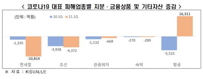 1분기 지분·금융상품 및 기타자산은 △면세점 –1조814억 원 △조선 –4372억 원 △관광레저 –668억 원 △숙박 –289억 원 순으로 감소했다.