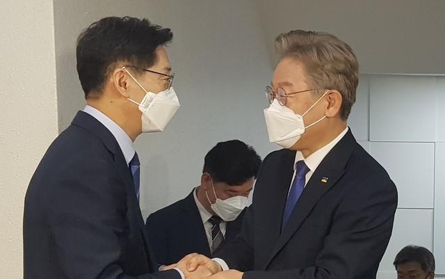 ▲김경수 경남지사(왼쪽)가 지난 17일 오전 2층 집무실 앞에서 공동협력을 위한 정책협약 체결을 위해 도청을 방문한 이재명 경기지사의 손을 잡고 반갑게 인사하고 있다. [뉴시스]