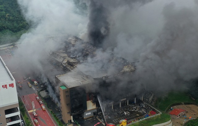 ▲ 지난 18일 오후 경기 이천 쿠팡 덕평물류센터 화재현장에서 소방관들이 진화작업을 하고 있다. [뉴시스]