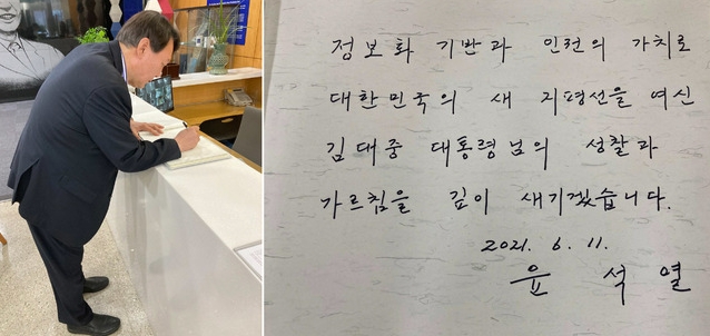 윤 전 총장이 지난 11일 연세대 김대중도서관을 방문해 남긴 방명록의 일부 표현이 구설에 오르는 것은 이와 무관치 않다. 윤 전 총장은 도서관 방명록에 "정보화 기반과 인권의 가치로 대한민국의 새 지평선을 여신 김대중 대통령님의 성찰과 가르침을 깊이 새기겠습니다"라고 적었다.