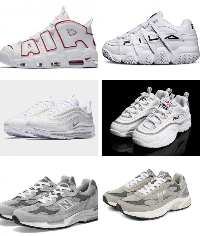 ▲ △나이키 에어모어 업템포(왼쪽)와 휠라 바리케이드 XT 97 △나이키 에어맥스 97(왼쪽)와 휠라 레이 △뉴발란스 992(왼쪽)와 휠라 듀플렉스 [각 사 제품 이미지 갈무리]